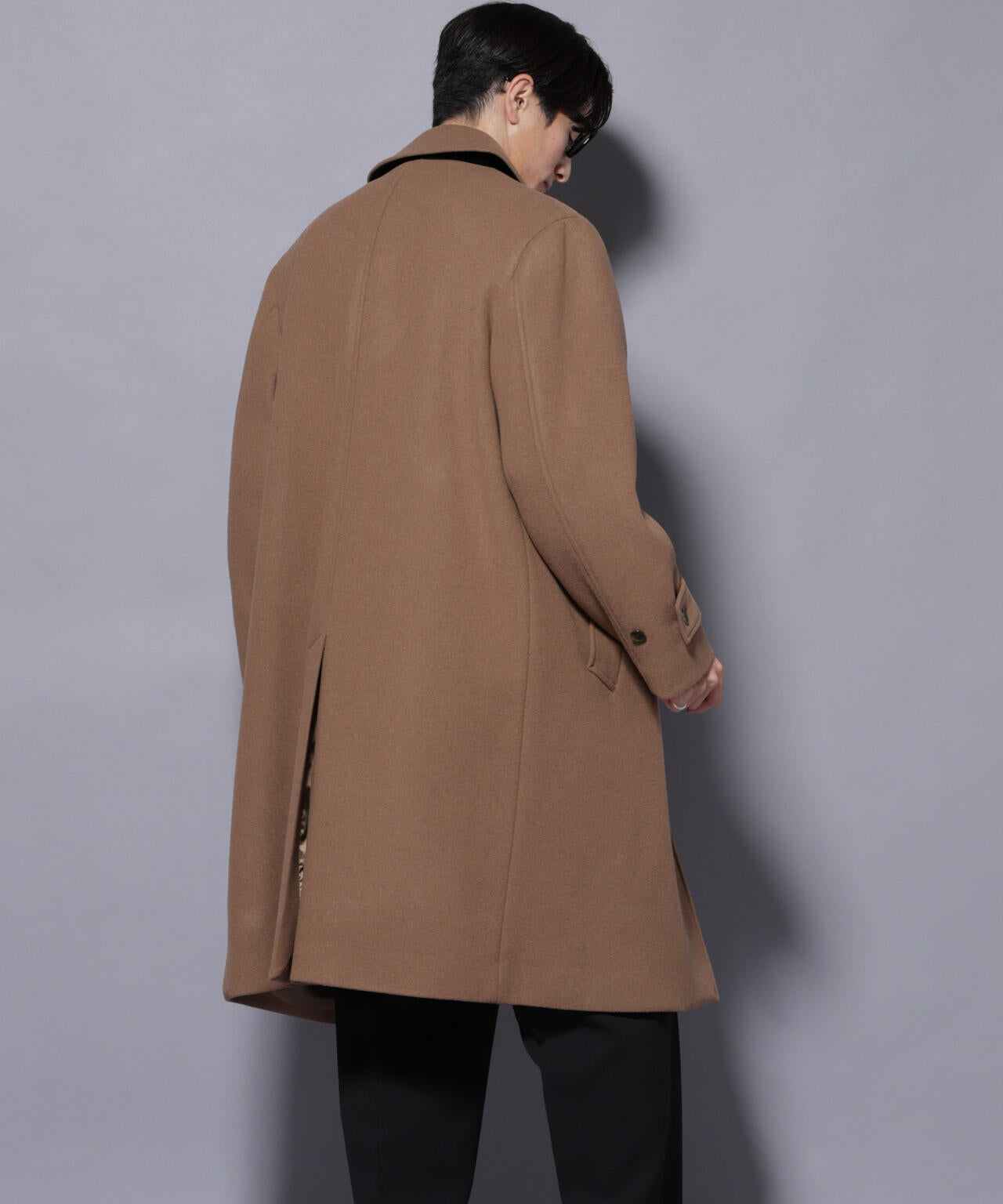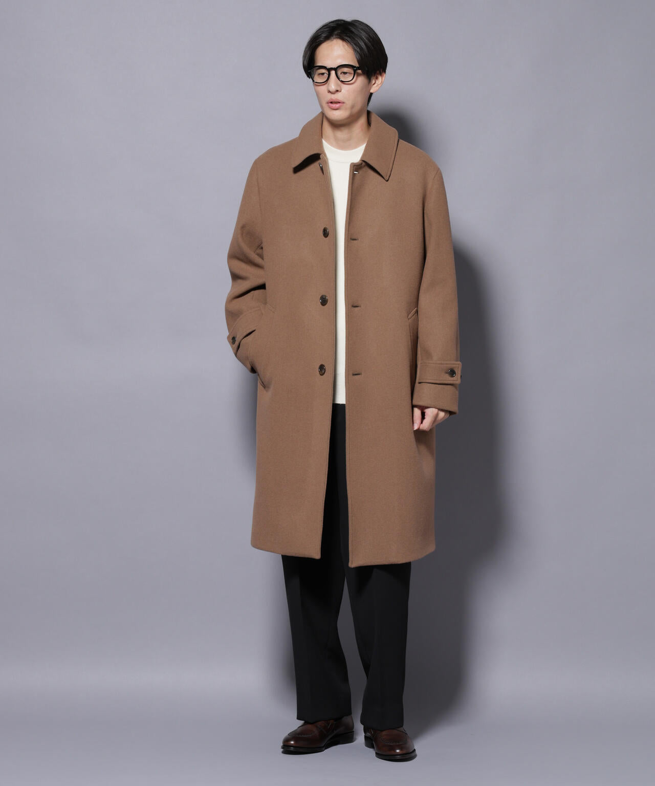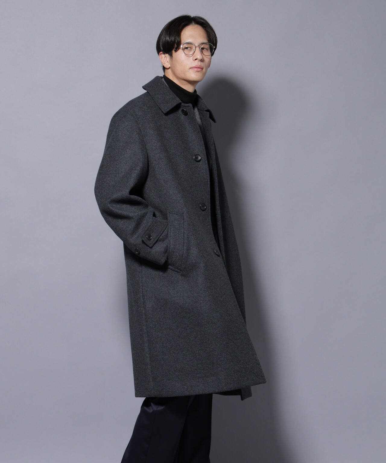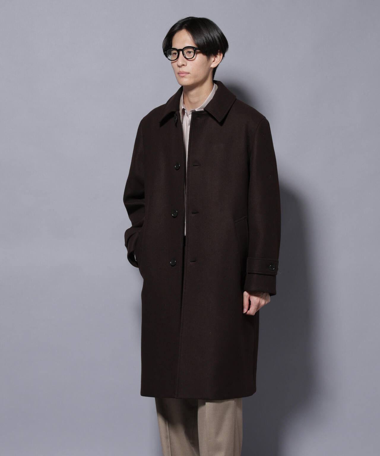 カシミヤミックスの上質な糸を使い、ふんわりとなだらかな肌触りで仕上げた、ナノユニバースオリジナルファブリックのソフトメルトンシングルコート。