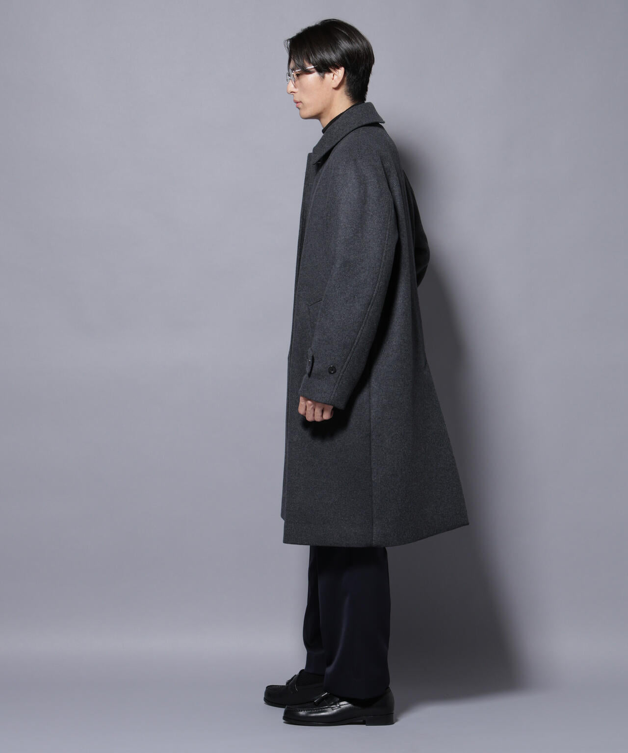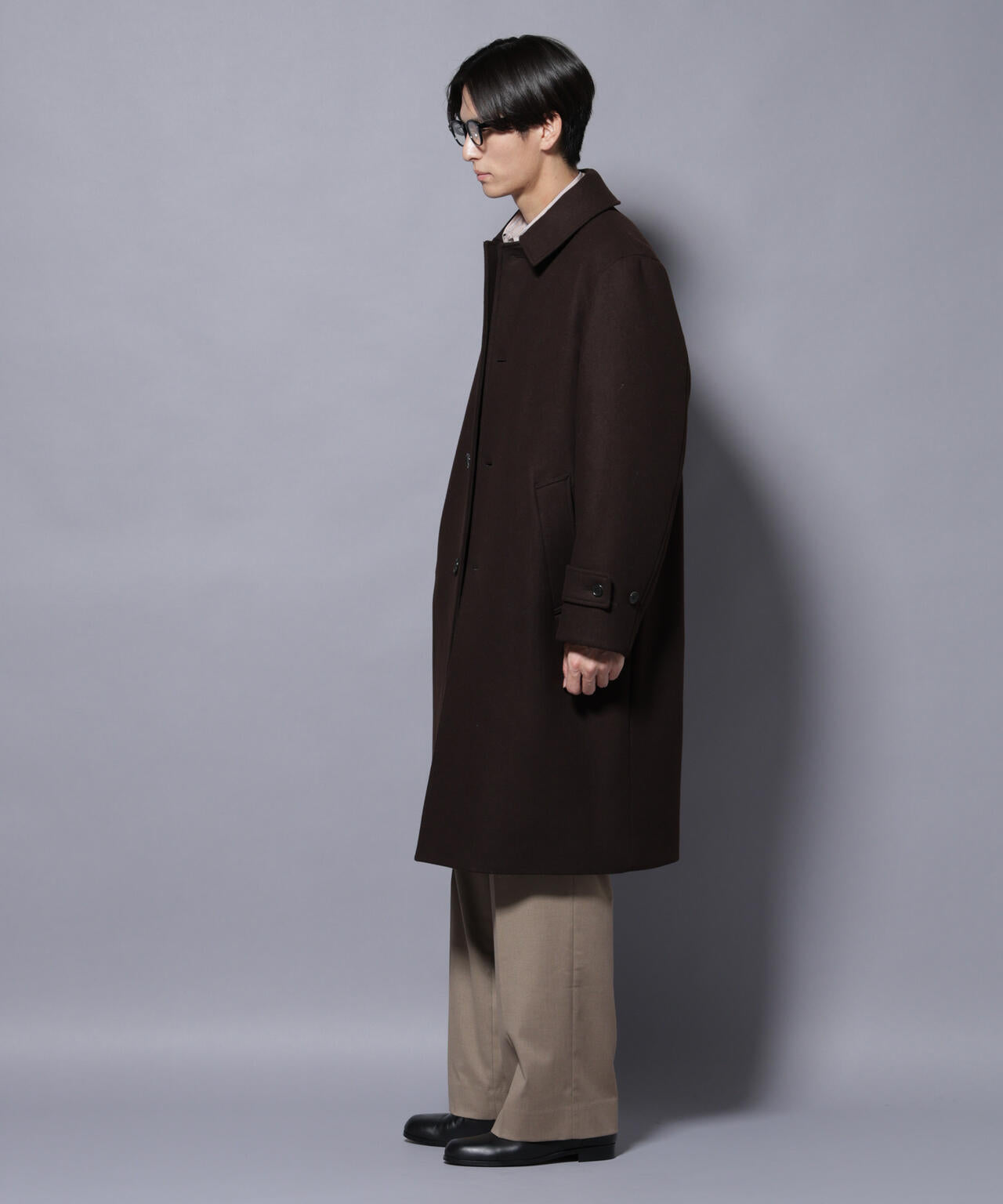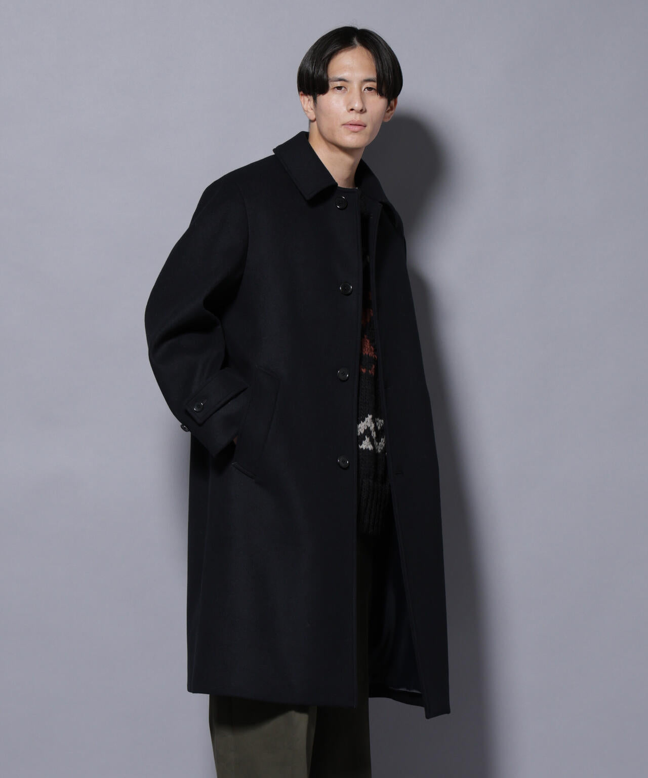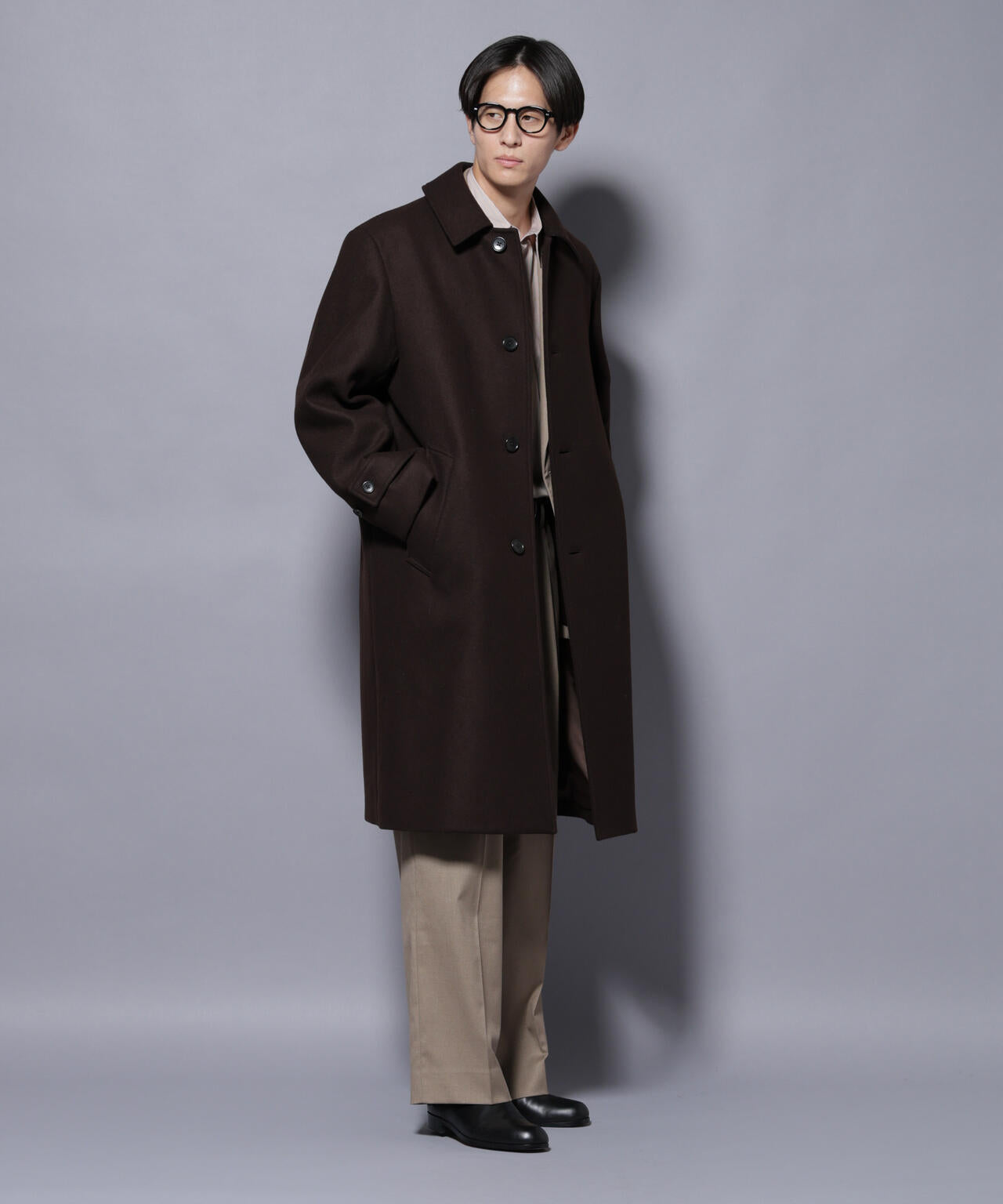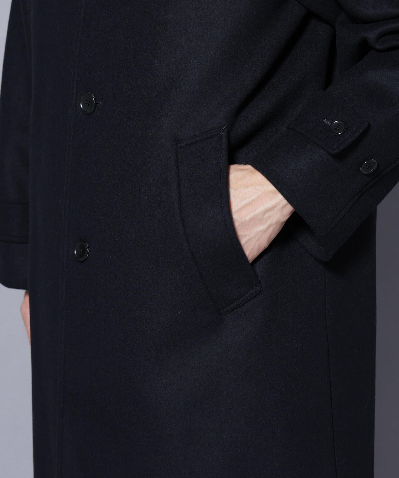 カシミヤミックスの上質な糸を使い、ふんわりとなだらかな肌触りで仕上げた、ナノユニバースオリジナルファブリックのソフトメルトンシングルコート。