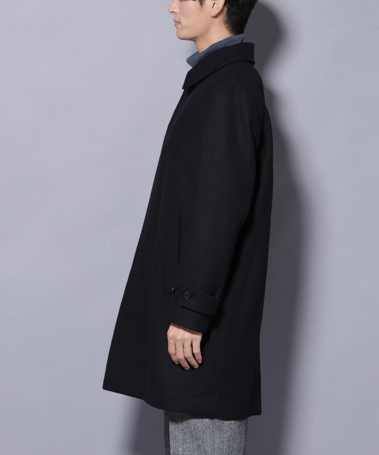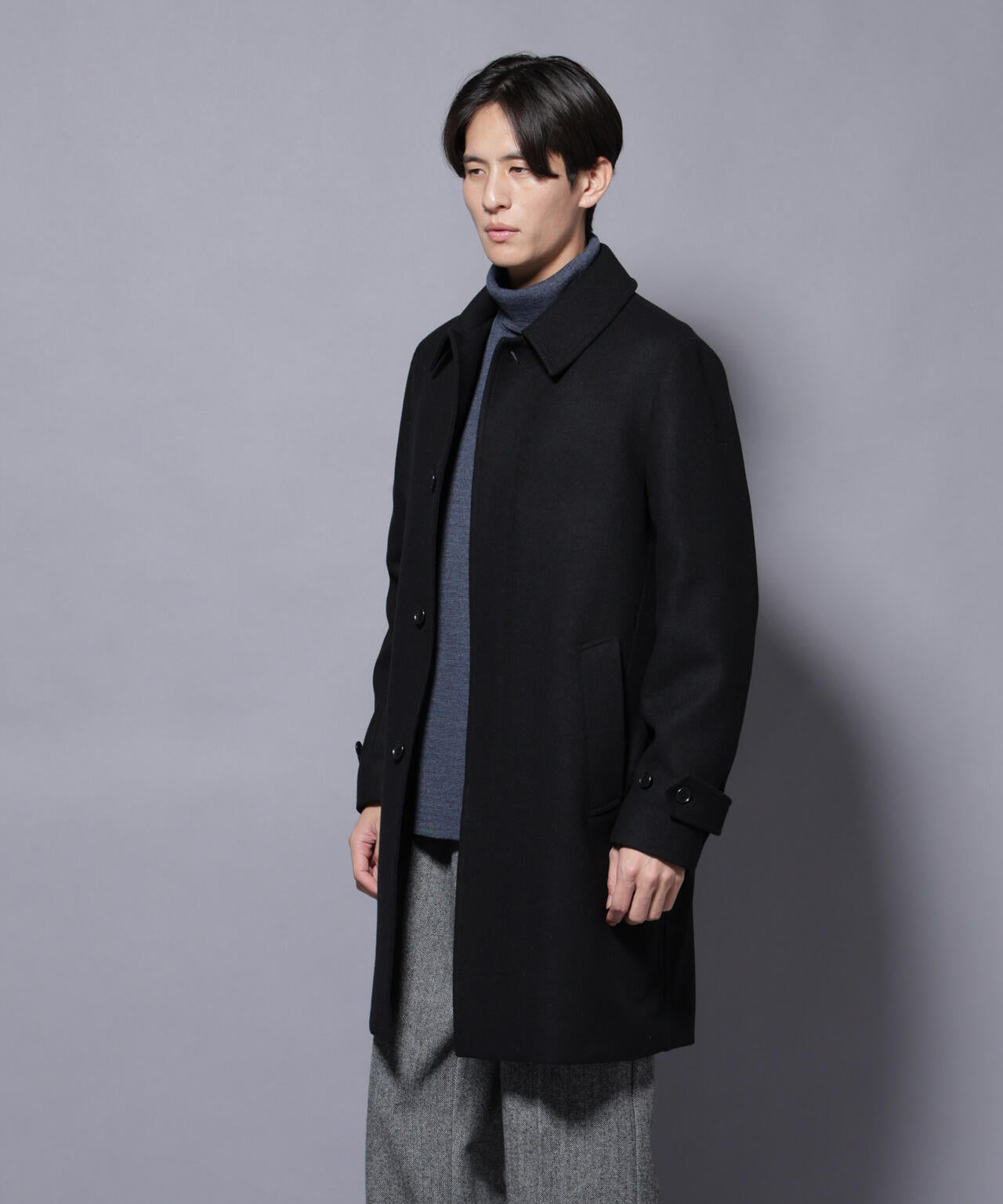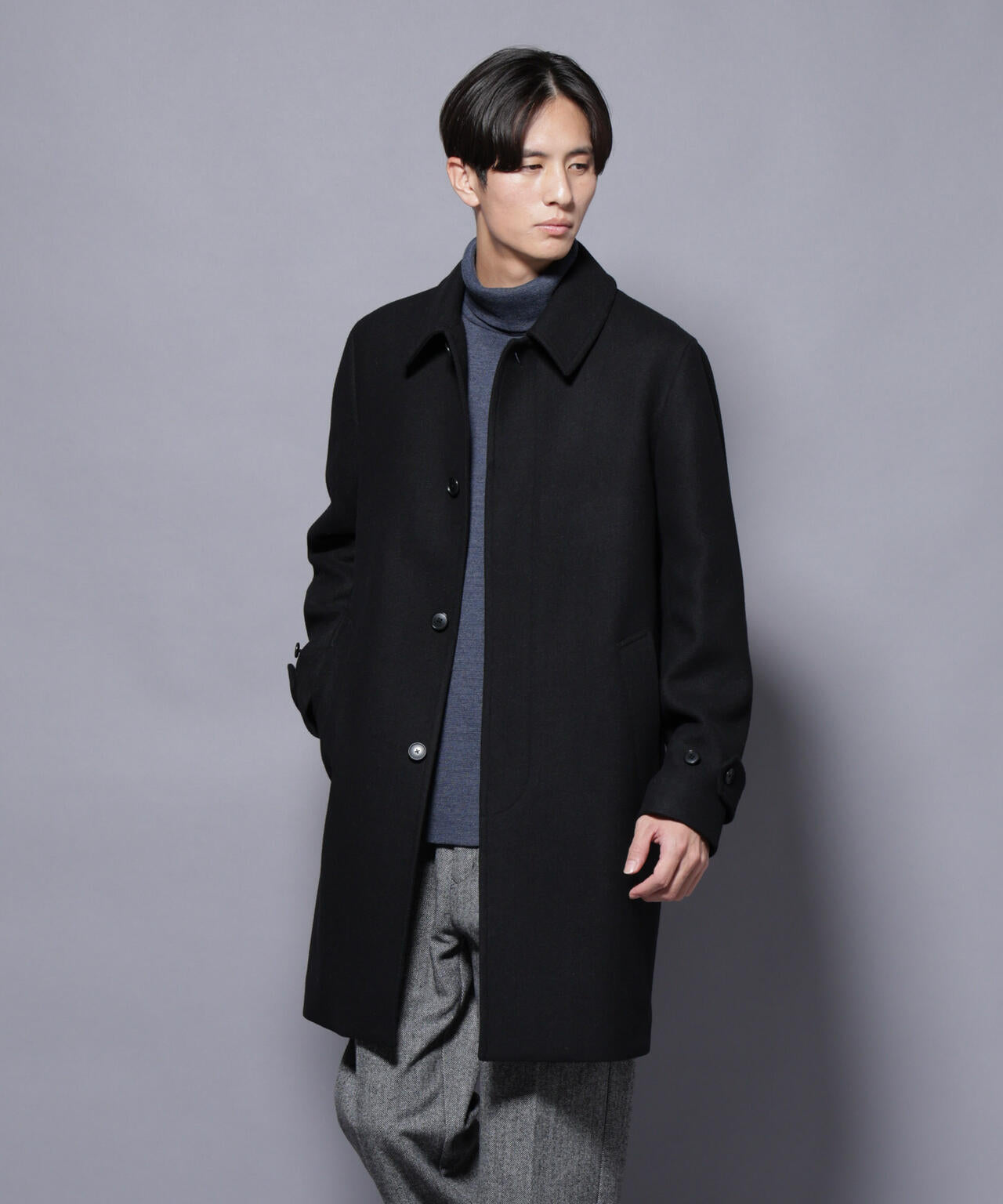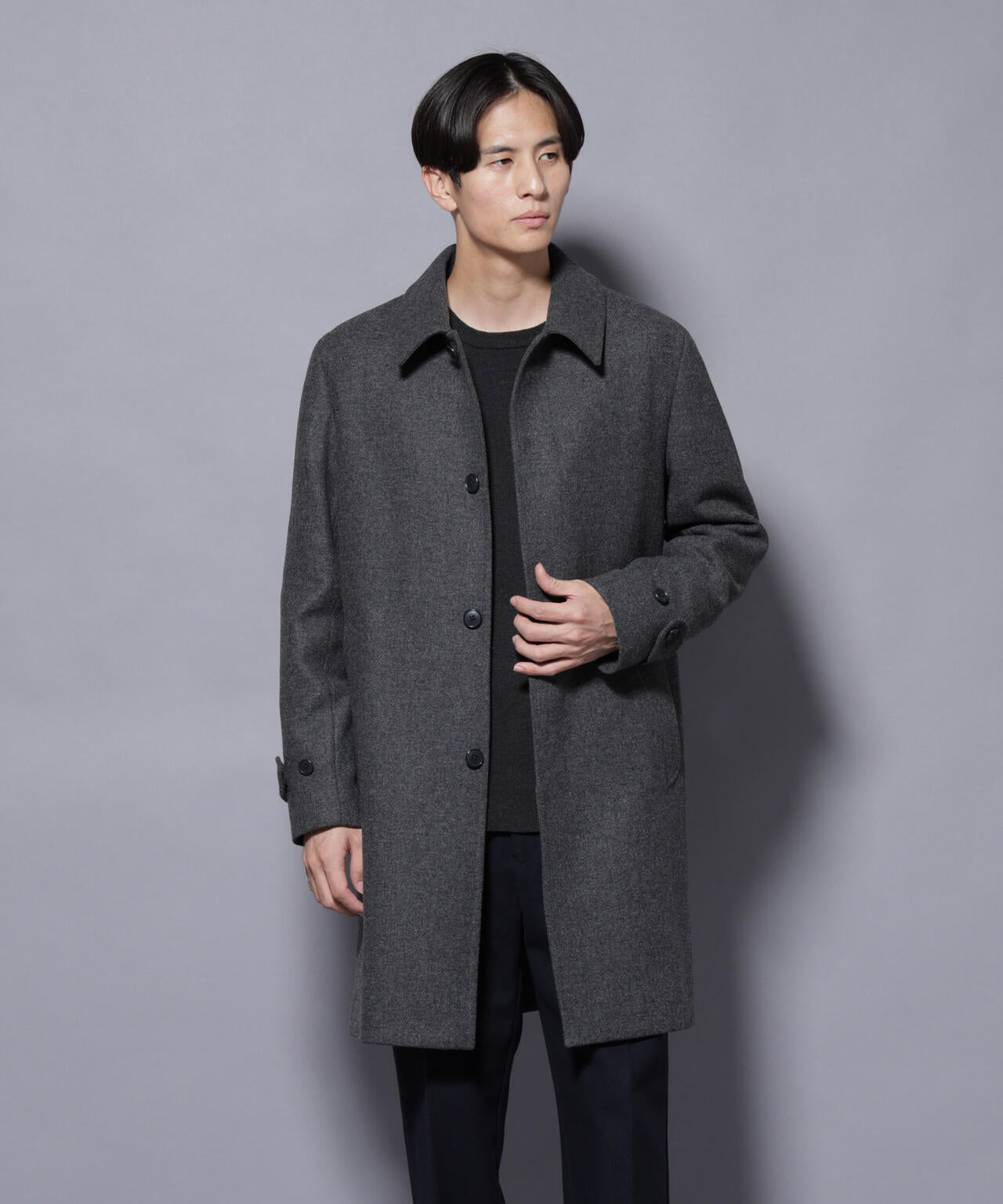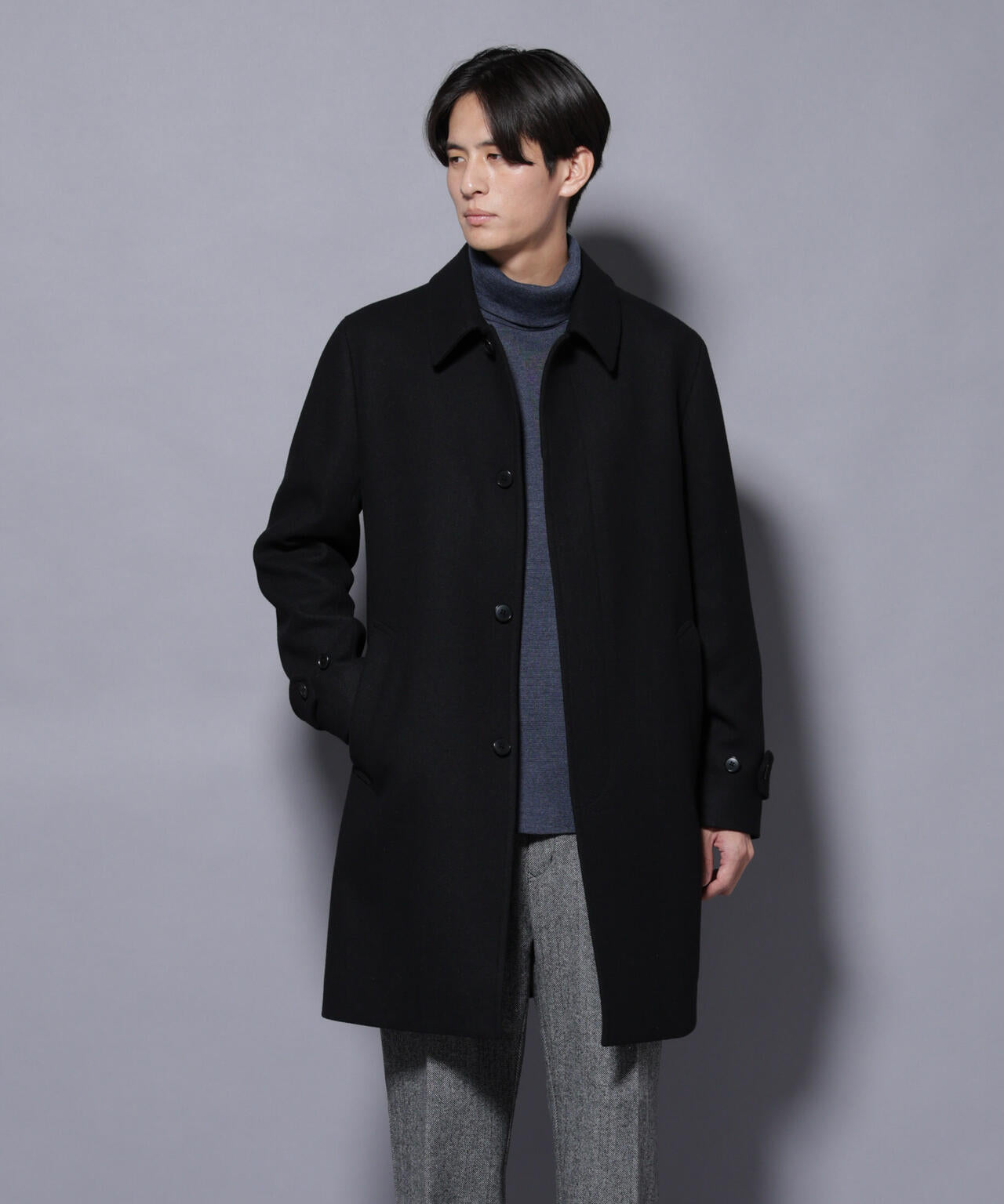 柔らかなウールブレンドメルトンを使用した端正なステンカラーコート。比翼仕立てによるミニマルなフロントデザインが、洗練された印象を演出。ビジネスシーンはもちろん、休日のカジュアルスタイルにも活躍する汎用性の高いアイテムです。